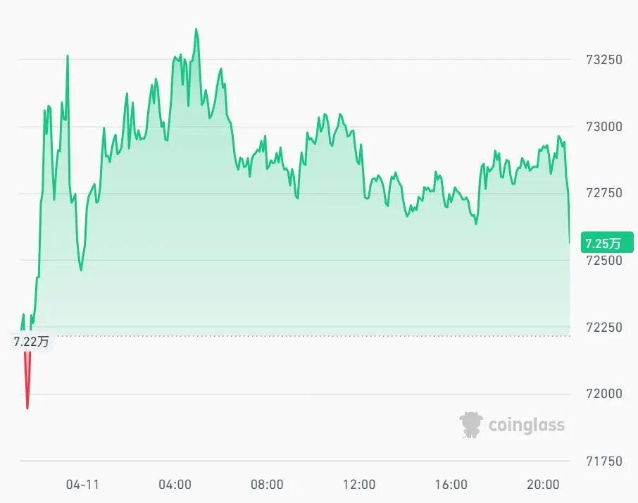 晚间,仍在交易的加密货币小幅跳水,截至发稿,比特币回落至72600美元下方,以太坊涨幅也回落。